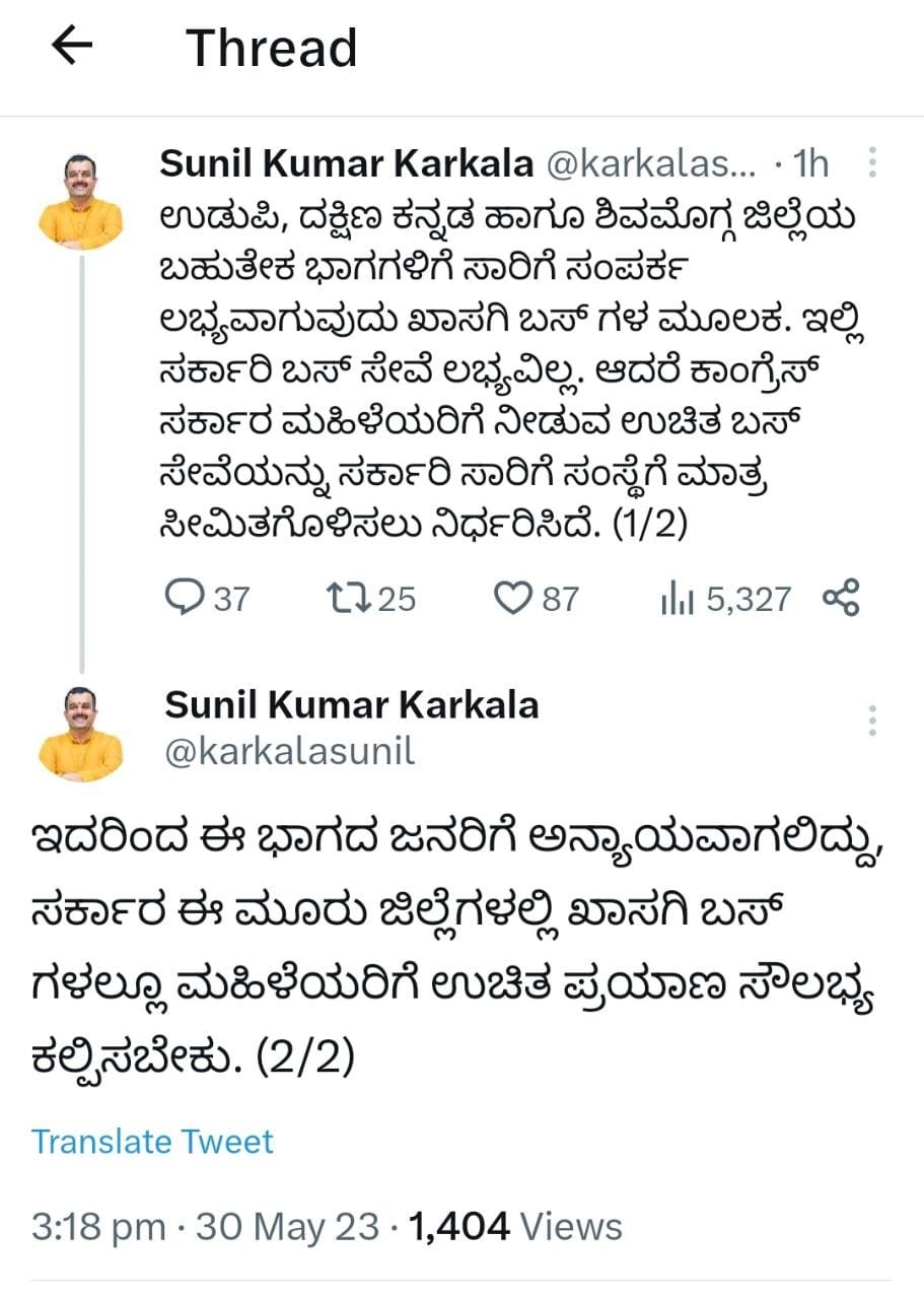 ಈ ವಿಚಾರವಾಗಿ ಮಾಧ್ಯಮದವರೊಂದಿಗೆ ಮಾತನಾಡಿದ ಉಡುಪಿ ಜಿಲ್ಲಾ ಕಾಂಗ್ರೆಸ್ ಕಾರ್ಯಧ್ಯಕ್ಷರಾದ ಕಿಶನ್ ಹೆಗ್ಡೆ ಕೊಳ್ಕೆಬೈಲ್ರವರು, ಬಿಜೆಪಿಗೆ ಅಧಿಕಾರ ಕಳೆದುಕೊಂಡು ಹುಚ್ಚು ಹಿಡಿದಿದೆ. ಸರ್ಕಾರ ನಡೆಸಿದ ಅನುಭವ ಹೊಂದಿರುವ ಮಂತ್ರಿ, ಖಾಸಗಿಯಲ್ಲಿ ಸರಕಾರಿ ವ್ಯವಸ್ಥೆ ನೀಡಿಲು ಹೇಳುತ್ತಿದ್ದಾರೆ. ಸರಕಾರ ಕೆಎಸ್ಆರ್ಟಿಸಿ ಯನ್ನು ಉಚಿತವಾಗಿ ನಡೆಸುತ್ತಿಲ್ಲ. ಅದೊಂದು ಸಂಯುಕ್ತ ಸಂಸ್ಥೆಯಾಗಿದೆ. ಕೆಎಸ್ಆರ್ಟಿಸಿ ಗೆ ಕೊಟ್ಟಂತೆ ಅದರ ಪಾವತಿಯನ್ನು ಕೊಡುವುದಾದರೆ ಖಾಸಗಿ ಬಸ್ ಉಚಿತವಾಗುತ್ತದೆ. ತಮ್ಮ ಸರ್ಕಾರವಿರುವಾಗ ಖಾಸಗಿಗಳಿಗೆ ತೊಂದರೆ ಕೊಟ್ಟಿರುವ ಸುನಿಲ್ ಕುಮಾರ್ ರಿಂದ ಇಂತಹ ಹೇಳಿಕೆಗಳು ಅಗತ್ಯವಿಲ್ಲ. ಅವರು ಇಂತಹ ಬಾಲೀಶ ಹೇಳಿಕೆಗಳನ್ನು ಕೊಡುವುದು ನಿಲ್ಲಿಸಲಿ. ನಾವು ಹೇಳಿರುವುದಕ್ಕೆ ಬದ್ಧರಾಗಿ 5 ಗ್ಯಾರಂಟಿಗಳನ್ನು ಜಾರಿಗೊಳಿಸುತ್ತೇವೆ. ಸುನಿಲ್ ಕುಮಾರ್ ಅವರಿಗೆ ತಮ್ಮ ಇಲಾಖೆಯ ಬ್ರಷ್ಟಾಚಾರವನ್ನು ಜಿಲ್ಲೆಯ ಎಲ್ಲಾ ಕಾಂಗ್ರೆಸ್ ಕಾರ್ಯಕರ್ತರು ಸೇರಿ ಸಿಒಡಿ ಮತ್ತು ಸಿಬಿಐ ಗೆ ಕೊಡುತ್ತೇವೆಂಬ ಭಯ ಶುರುವಾಗಿದೆ. ಇನ್ನೆರಡು ದಿನಗಳಲ್ಲಿ ಸುನಿಲ್ ಕುಮಾರ್ ಇಲಾಖೆಯ ಬ್ರಷ್ಟಾಚಾರವನ್ನು ಸಿಒಡಿ ಮತ್ತು ಸಿಬಿಐ ಗೆ ಕೊಡುವಂತೆ ರಾಜ್ಯ ಸರ್ಕಾರಕ್ಕೆ ಮನವಿ ಮಾಡುತ್ತೇವೆ. 40% ಮೀರಿದ ಬ್ರಷ್ಟಾಚಾರ ಬಿಜೆಪಿ ಸರ್ಕಾರದ್ದು. ಬ್ರಷ್ಟಾಚಾರ ಮಾಡದ ಇಲಾಖೆ ಬಜೆಪಿಯಲ್ಲಿ ಇರಲಿಲ್ಲ ಎಂದರೆ ತಪ್ಪಾಗಲಿಕ್ಕಿಲ್ಲ. ಜನತೆ ನಮ್ಮ ಮೇಲೆ ನಂಬಿಕೆಯನ್ನಿಟ್ಟು ಕಾಂಗ್ರೆಸ್ನ್ನು ಆರಿಸಿದೆ. ಆರಿಸಿದ ಜನರಿಗೆ ನ್ಯಾಯ ಒದಗಿಸಬೇಕಾದರೆ ಬಿಜೆಪಿಯ ಸಮಸ್ತ ಬ್ರಷ್ಟಾಚಾರವನ್ನು ಬಯಲಿಗೆಳೆಯಬೇಕು. ಉಭಯ ಜಿಲ್ಲೆಗಳಲ್ಲಿ ಕೋಟ ಶ್ರೀನಿವಾಸ ಪೂಜಾರಿ ಮತ್ತು ಸುನಿಲ್ ಕುಮಾರ್ ಅವರು ಅಖಂಡವಾಗಿ ಬ್ರಷ್ಟಾಚಾರ ಮಾಡಿದ್ದಾರೆ. ಇವರೆಲ್ಲರ ಮೇಲೆ ಇಲಾಖಾವಾರು ತನಿಖೆ ನಡೆಸಬೇಕೆಂದು ತೀವ್ರವಾಗಿ ಆಗ್ರಹಿಸದರು.