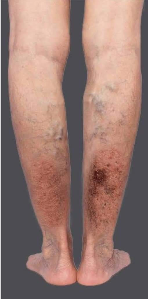2. ಮುಂದುವರಿದ ಹಂತದಲ್ಲಿ ಕಾಲಿನ ಮೇಲ್ಭಾಗದಲ್ಲಿ ಚರ್ಮ ದಪ್ಪಗಾಗುವುದು ಮತ್ತು ಕಪ್ಪಾಗುತ್ತದೆ. ಚರ್ಮದಲ್ಲಿ ವಿಪರೀತ ತುರಿಕೆ ಇರುತ್ತದೆ.